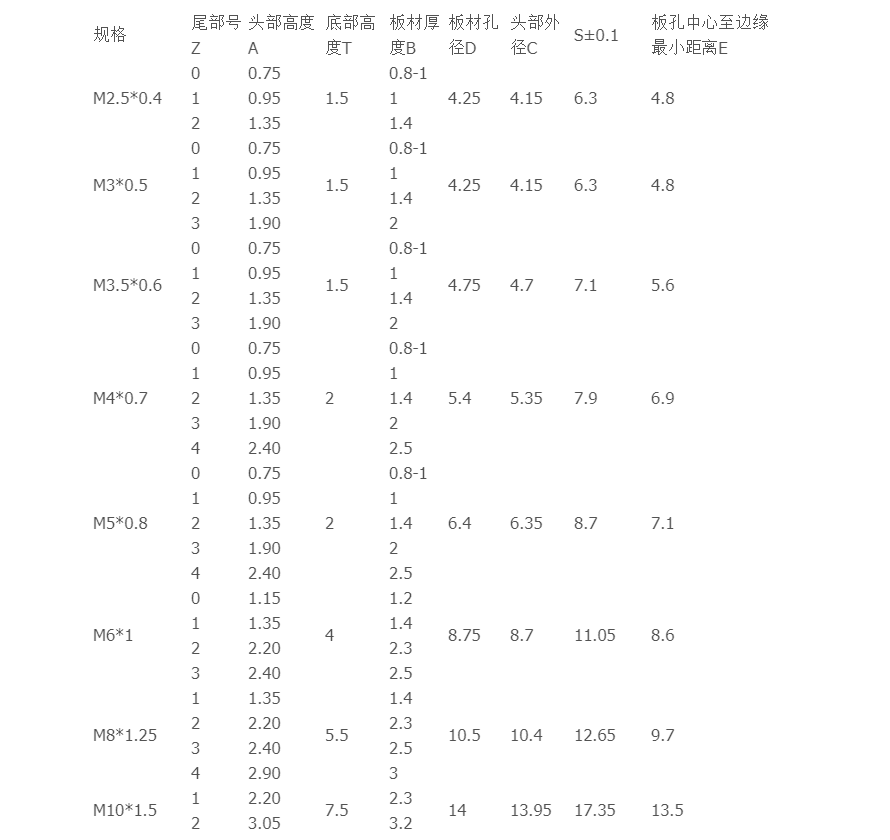 3.適用于各種厚度的板材,Zui小厚度0.8mm,使用時必須根據(jù)板材厚度和螺母規(guī)格,才能確定A尺寸對應(yīng)的尾部號Z,用戶根據(jù)板材厚度依據(jù)表中尾部號選樣訂貨;
