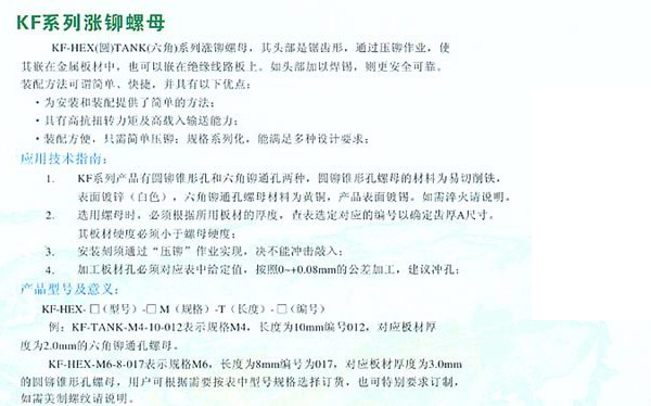 擠壓螺母(型號(hào):KF(KFS))內(nèi)螺紋緊固件,用于裝配PC版。螺紋尺寸#2到#10和M2和M5,廣泛應(yīng)用于工業(yè)行業(yè),螺母是將機(jī)械設(shè)備緊密連接起來(lái)的零件,通過(guò)內(nèi)側(cè)的螺紋,同等規(guī)格螺母和螺栓才能連接在一起。