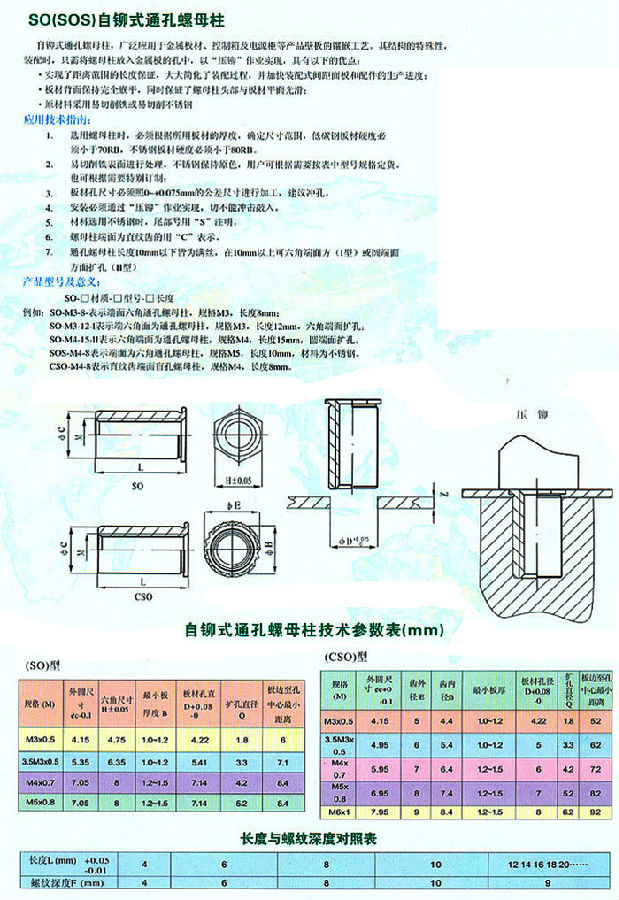 SO(SOS)壓鉚螺母柱廣泛應(yīng)用于金屬板材、控制箱及電源柜等產(chǎn)品壁板的鑲嵌工藝。其結(jié)構(gòu)的特殊性,裝配時,只需將螺母柱放入金屬板的孔中,
